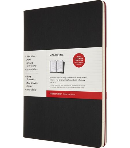 Moleskine - legendarisk og tidløst håndværk fra MilanoMoleskine er enestående og tidløst håndværk og design, i en kvalitet, som du kan stole på. Det italienske luksusmærke er særligt kendt for sine legendariske notesbøger, men Moleskine laver også penne og kalendere i sin karakteristisk elegante og tidløse stil. Der er altså en grund til, at bl.a. forfattere, kunstnere, intellektuelle og rejsende foretrækker Moleskine. Vincent van Gogh, Pablo Picasso og Ernest Hemingway udtænkte store værker med en Moleskine notesbog i hænderne – og nu kan du gøre det samme.Moleskine Cahier Subject NotebookMed sit enkle og underspillede design, er Moleskine Cahier serien en favorit hos dem, som tager mange noter. Moleskine Cahier notesbøgernes papomslag gør dem oplagte at personliggøre – skriv dit yndlingscitat, mal et portræt eller et landskab, eller giv din notesbog et navn. Cahier Subject er struktureret i et layout, der hjælper dig til at fokusere på dine ideer og få mest muligt ud af lektioner. Designet er perfekt til at tage noter på og hver side er indelt i 5 sektioner; dato, titel, noter, nøgleord og en boks til opsummering, konklusioner og næste skridt.Notesbogens slidstærke og robuste materialer indikerer, at den er designet til at blive brugt dag efter dag, indtil alle sider er udfyldt. Moleskine Cahier notesbøgerne er lette og meget fleksible. Den sanselige og rå overflade med tydelig bomuldstråd hvor siderne er syet sammen giver notesbogen et naturligt, håndlavet udtryk. Det gør det til en helt særlig oplevelse at skrive i en Moleskine Cahier notesbog. Notesbogens sidste 16 sider er perforerede, så de nemt kan tages ud. Notesbogen indeholder desuden en klap, som kan bruges til f.eks. løse papirer, bonner og visitkort.Moleskine Cahier Subejct notesbøgerne sælges i sæt a 2 stk.Moleskine farver: Black og Cranberry RedMoleskine størrelse: A4Mål: 21 x 29,7 cmInddelt i subject-layoutBlødt omslag160 siderSyrefrit papir, 70 gIndeholder 2 stickersark ...