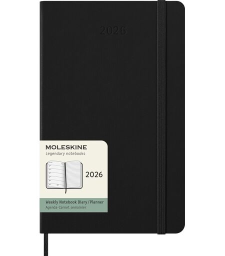Denne ugekalender i Large-format kombinerer klassisk Moleskine-stil med en praktisk ugeoversigt og ekstra plads til noter. Med en hel uge pr. opslag og en dedikeret side til notater, er den perfekt til dig, der ønsker både struktur og fleksibilitet i hverdagen.Det hårde omslag beskytter indholdet året rundt, mens bogmærkesnor og elastiklukning sikrer, at du altid har styr på din planlægning – uanset om du bruger kalenderen på kontoret, i tasken eller på farten. Vigtigste fordele Ugeopslag med alle ugens dage til venstre og notatside til højre Hårdt omslag med god holdbarhed og stabil skriveflade Elastiklukning og matchende bogmærkesnor Årsoversigt og månedligt overblik inkluderet Kompakt Large-format med god skriveplads uden at fylde for meget Gennemtænkt layout til hverdagens planlægning Kalenderen har et overskueligt horisontalt layout, hvor du får hele ugens dage samlet på én side – og masser af plads til noter på modsatte side. Den egner sig til både arbejde, studie og privat brug og giver et godt balancepunkt mellem struktur og frihed.Moleskine-designet sikrer høj funktionalitet, æstetik og brugervenlighed i ét og samme værktøj. Specifikationer Model: Weekly Notebook Diary / Planner Layout: Horisontalt – ugevisning + linjeret noteside Format: Large (13 × 21 cm) Indhold: Januar–december 2026 Sprog: Engelsk Papir: Elfenbensfarvet, 70 g/m² Omslag: Hard Cover med afrundede hjørner Lukning: Elastik og bogmærkesnor Ekstra: Udvidelig papirlomme og klistermærker Farve: Sort ...