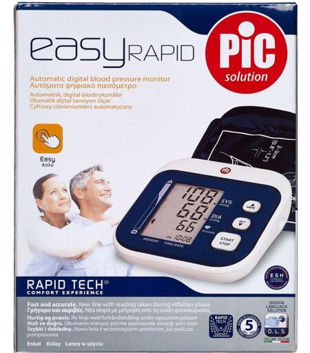 EasyRapid er et automatisk blodtryksapparat, der er produceret ud fra de nyeste teknologier. EasyRapid gør det muligt konstant at måle blodtrykket, men skal ikke erstatte regelmæssige besøg hos lægen. Dette apparat giver mulighed for en hurtig og dermed mindre ubehagelig kontrol, fordi målingen allerede foregår under manchettens oppumpningsfase. Bemærkning Når man ikke har i sinde at bruge apparatet i et stykke tid, skal batterierne fjernes. Batterierne må ikke smides i skraldespanden. Tilbehøret, de bevægelige dele og elektromedicinsk udstyr skal bortskaffes i henhold til de lokale bestemmelser.Skal opbevares tørt, væk fra sollys. Undgå desuden kontakt med vand.Undgå målinger lige efter indtag af et større måltid, efter rygning eller efter man har drukket te, kaffe eller alkohol.Undgå målinger, hvis du er stresset, træt eller fysisk udmattet.Du må ikke bevæge dig eller tale under målingen. Derudover må du ikke krydse benene, og fødderne skal holdes på jorden.Målingen kan foretages på begge arme; man kan dog af og til opnå forskellige resultater, og det anbvefales derfor altid at foretage målingen på samme arm.Enheden egner sig ikke til konstant monitorering i tilfælde af medicinske nødstilfælde eller indgreb. Dosis og anvendelse Slut manchettens luftslange til apparatet, og rul den rundt med endestykket omkring manchetten.Før armen ind i manchetten. Slangen skal vende mod hånden. Drej håndfladen opad. Manchetten skal være placeret 2-3 cm fra albuen. Stram manchetten.Tryk på krogen, og rul materialet stramt omsig selv. Figuren af venen skal placeres på hovedpulsåren.Stræk armen ud på bordet, så manchetten er i samme højde som hjertet. Luftslangen må ikke være bøjet.Tryk på knappen start/stop for at tænde apparatet og indlede målingen, når måleren er slukket.Tryk på start/stop for at slukke apparatet, i modsat tilfælde slukker det inden for 1 minut. Bemærk: Tryk start/stop for at afbryde målingen i et hvilket som helst øjeblik.Når blodtryksmåleren er slukket, skal du trykke på knappen "MEM" for at vise gennemsnittet af de sidste 3 aflæsninger. Hvis der er færre end 3, vises den sidste måling. ...