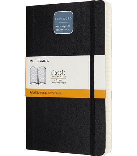 Moleskine - legendarisk og tidløst håndværk fra MilanoMoleskine er enestående og tidløst håndværk og design, i en kvalitet, som du kan stole på. Det italienske luksusmærke er særligt kendt for sine legendariske notesbøger, men Moleskine laver også penne og kalendere i sin karakteristisk elegante og tidløse stil. Der er altså en grund til, at bl.a. forfattere, kunstnere, intellektuelle og rejsende foretrækker Moleskine. Vincent van Gogh, Pablo Picasso og Ernest Hemingway udtænkte store værker med en Moleskine notesbog i hænderne – og nu kan du gøre det samme.Moleskine Classic Soft Cover Notesbog i str. large expanded med linjeret papirMoleskine Classic serien består af enkle, men klassiske notesbøger med særlige kendetegn, som smukt afrundede hjørner og en smart elastiklukning. Det syrefri cremefarvede papir absorberer blæk uden at det løber igennem på den modsatte side og du kan viske blyant ud mange gange, uden at papiret bliver nusset. Moleskine Classic Soft Cover Expanded Version notesbøgerne har ekstra mange sider hvilket giver plads til non-stop notestagning og giver dig mulighed for at udvikle og forme større ideer og projekter. Dertil har notesbogen et fleksibelt men robust omslag, som kan åbne 180° og ligge helt fladt og samtidig kan tilpasse sig kroppens bevægelser og derfor kan passe i enhver lomme. Tag den med dig rundt omkring og fyld den med dine unikke ideer, noter, tanker og kruseduller. Du bestemmer hvad du fylder de blanke sider med.Notesbogens slidstærke og robuste materialer indikerer, at den er designet til at blive brugt dag efter dag, indtil alle sider er udfyldt. Moleskine Classic Expanded notesbøger indeholder to bogmærkebånd og en ekspanderbar lomme på sidste side, som kan bruges til f.eks. løse papirer, bonner og visitkort. Moleskine farve: BlackMoleskine størrelse: Large ExpandedMål: 13 x 21 cmLinjeretBlødt omslag400 siderSyrefrit papir, 70 g2 bogmærkebåndHoldes lukket med elastikMoleskine logo på bagsiden ...