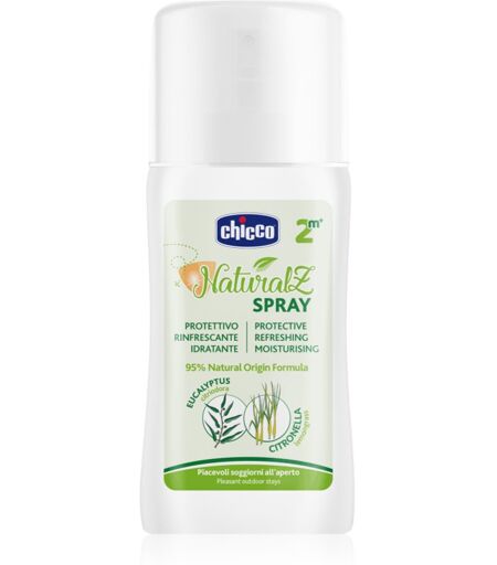 Chicco NaturalZ Protective Spray, 100 ml, Insektbid og myggemidler til børn, Præparatet er til specialpleje af børnehud. Egenskaber: har en beroligende virkning fugter og blødgør huden efterlader et beskyttende lag på huden til sensitiv børnehud praktisk og hygiejnisk påføring skaber ikke en skinnende og fedtet finish på huden har en blødgørende virkning Ingredienser: indeholder mindst 97 % ingredienser af naturlig oprindelse Brugsvejledning: Anvendes når som helst i løbet af dagen. ...