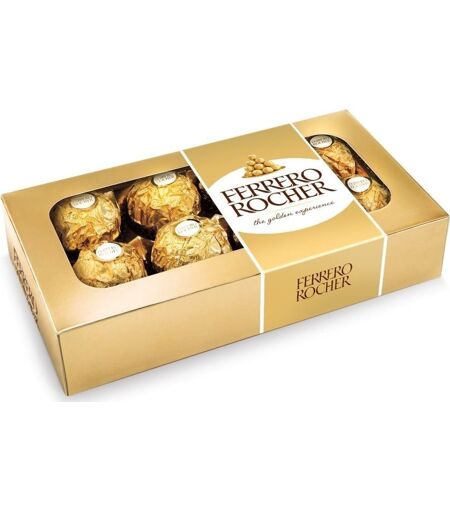 Skab gyldne stunder for dig selv og dine nærmesteFerrero Rocher er en uimodståelig kombination af cremet mælkechokolade, hele hasselnødder og en let, sprød vaffel. Den originale italienske opskrift, råvarer af høj kvalitet og den sofistikerede guldindpakning giver dig gyldne stunder med nydelse og velbehag, samt en helt fantastisk smagsoplevelse.Indhold: 100 gÆske med 8 stk. ...
