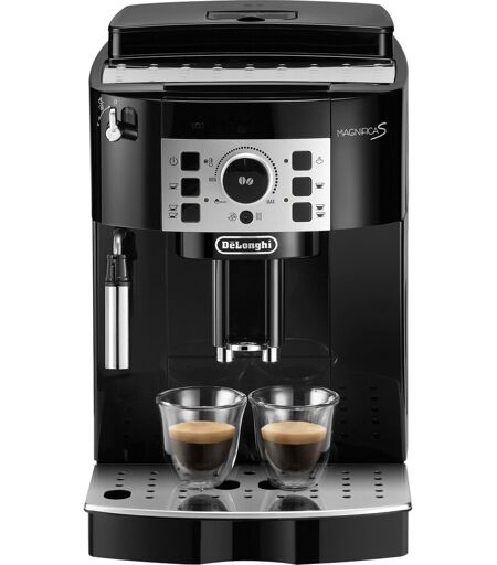 Magnifica S ECAM 20.116.B fra DeLonghi er en fuldautomatisk kaffemaskine i særklasse. Maskinen er meget nem at bruge, vandtanken kan let fjernes foran og fyldes. Bønnebeholderen med aromabeskyttelseslåg er placeret øverst såvel som kaffepulverrenden. Slibegraden samt kaffemængden og styrken kan let justeres. Den integrerede mælkeskumdyse tillader også tilberedning af traditionel mælkeskum eller varm mælk til yderligere kaffenydelse. Den fuldautomatiske kaffemaskine tilbyder et fuldautomatisk skylle- og afkalkningsprogram. ...