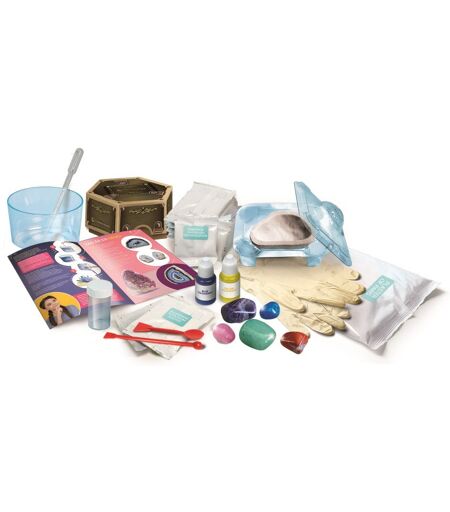 Et spil med alt det nødvendige til at skabe glitrende, farvede kæmpekrystaller! Ædelsten at studere og samle: ametyst, blå agat og mange flere, der venter på at blive opdaget! En støbeform til reproduktion af en fascinerende geode, som kan beriges med masser af farvede krystaller. Den detaljerede videnskabelige manual indeholder alle hemmelighederne bag dannelsen af krystaller og saltenes kemiske reaktioner! ...