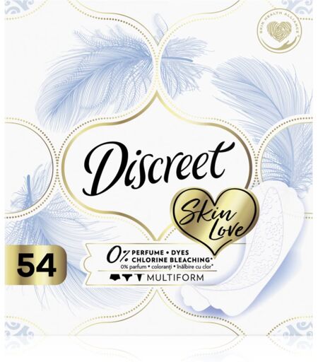 Discreet Multiform Skin Love, 54 stk., Trusseindlæg til kvinder , Maksimal komfort og 100 % beskyttelse under en menstruationscyklus. Hygiejnebind Discreet Multiform Skin Love sikrer dig en følelse af komfort og sikkerhed i løbet af dine dage. Egenskaber: meget åndbart en ideel størrelse til dage med let blødning med en let parfumering den forbliver sikkert på plads, selv når du bevæger dig ...