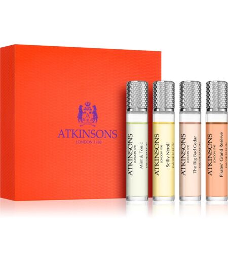 Atkinsons Mint & Tonic, 1 stk., Sæt til unisex unisex, Unisex parfumesættet Atkinsons Mint & Tonic giver dig en ideel mulighed for at nyde din yndlingsduft endnu mere og i længere tid. Den skønne duft gemmer sig ikke bare i en flakon, men også i kropsplejeprodukter. Det sikrer, at din daglige rutine på badeværelset vil matche perfekt, og din sanseoplevelse vil nå et helt nyt niveau. Giv din yndlingsdufts intensitet et boost med dette sæt. Egenskaber: unisex duft Sættet indeholder: Atkinsons Pirates' Grand Reserve Eau de Parfum 10 ml Atkinsons Scilly Neroli Eau de Parfum 10 ml Atkinsons Mint & Tonic Eau de Parfum 10 ml Atkinsons The Big Bad Cedar Eau de Parfum 10 ml ...
