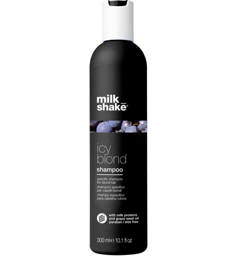 Specifik shampoo til blond hår. Renser håret blidt med et specifikt sort pigment, der modvirker gule eller orange toner i blondt eller lysnet hår, hvilket giver asketoner. Info: milk_shake icy blond produkter ...