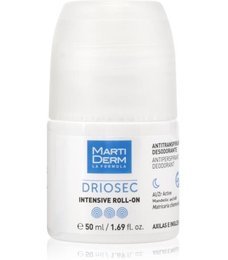 MartiDerm Driosec Intensive Roll-On, 50 ml, Antiperspiranter til kvinder , Antiperspiranten MartiDerm Driosec absorberer sveden og neutraliserer lugten optimalt. Giver dig en følelse af friskhed og renhed hver dag. Egenskaber: beskytter effektivt mod sved beskytter mod en ubehagelig lugt virker, mens du sover Ingredienser: dermatologisk testet Brugsvejledning: For at opnå en maksimal effekt skal du altid anvende antiperspiranten om aftenen inden sengetid. ...