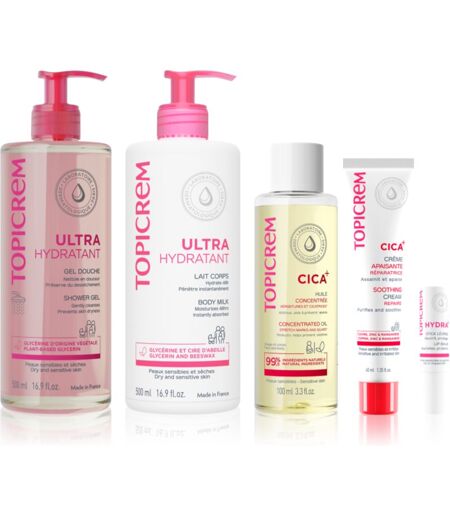Topicrem Gift Box, 5 stk., Sæt til moren til kvinder , Egenskaber: blødgør mærkbart huden virker præventivt mod, at der opstår strækmærker dufter behageligt praktisk og hygiejnisk påføring genopretter tør hud gennemfugter huden i dybden er god at påføre, trænger let ind egner sig også til følsom hud giver huden fornyet styrke nærer intenst og smidiggør Sættet indeholder: Topicrem UH FACE Ultra-Moisturizing Lip Balm Fugtgivende læbepomade Til tørre læber 4 g Topicrem CICA Soothing Cream Intensiv aldersfornyende creme Til Irriteret hud 40 ml Topicrem CICA Concentrated Oil Olie til ar og strækmærker 100 ml Topicrem UH BODY Ultra-Moisturizing Body Milk Dyb fugtgivende kropslotion Til tør og sensitiv hud 500 ml Topicrem UH BODY Gentle Cleansing Gel Mild rensegel til ansigt, krop og hår 500 ml Ingredienser: E-vitamin – nærer, yder antioxidativ beskyttelse mod for tidlig aldring og skader forårsaget af frie radikaler, hjælper med at udglatte rynker og genopbygge hudens fasthed og spændstighed bivoks – danner et vandfast beskyttende lag, der gør huden blød, beroliget, næret og beskyttet mod ydre påvirkninger i lang tid, fugter og forhindrer dehydrering og skader, fremskynder regenerering sheasmør – nærer, hjælper med til at opretholde den nødvendige fugt i huden, giver blødhed og glathed, yder beskyttelse mod udtørring og skadelige ydre påvirkninger ...