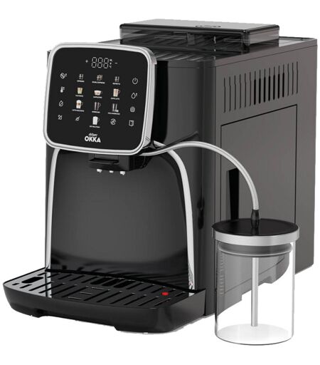 Oplev Arzum Okka OK0028 automatisk espressomaskine i elegant sort og kobber, designet til ægte kaffeelskere. Med et integreret mælkesystem og en kraftig 19-bar pumpe tilbereder den 11 forskellige drikkevarer, herunder espresso, dobbelt espresso, flat white, cappuccino, latte macchiato, ristretto, americano, iced americano, caffè latte og endda kaffepulver. Med en farveberøringsskærm og 12 maleindstillinger giver den fuld kontrol over kaffestyrke, temperatur (75-95°C) og portionsstørrelse. Vandtanken på 1,8 liter, kopopvarmningsoverfladen og bundbeholderens volumen på 10 portioner giver bekvemmelighed til brug derhjemme eller på kontoret. Med automatisk/manuel afkalkning, automatisk slukning og mælkeskumningsfunktion kombinerer OK0028 ydeevne, elegance og alsidighed i én maskine. ...