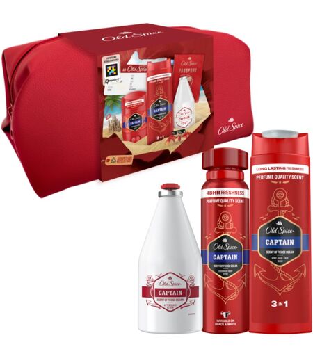 Old Spice Captain, , Kropssæt til mænd til mænd, Skab glæde med et kosmetiksæt Old Spice Captain , der er fyldt med herrekosmetik til kropspleje. Vil glæde enhver moderne mand, der passer på sit ydre. Sættet indeholder: Old Spice Captain Kropsvask til mænd 250 ml Old Spice Captain Aftershave vand 100 ml Old Spice Captain Deodorant Stick 50 ml kosmetiktaske 1 stk. Brugsvejledning: Brug alle produkterne i det kosmetiske sæt som angivet i vejledningen. ...