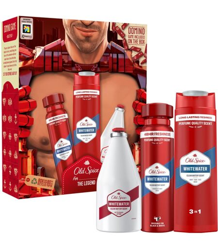 Old Spice Whitewater Ironman, , Kropssæt til mænd til mænd, Vil du forvandle et helt almindeligt brusebad til en særlig oplevelse, der er gennemstrømmet af en dejlig duft? Så vil brusegelen Old Spice Whitewater Ironman hjælpe dig med det. Mens dens uimodståelige duft vil forkæle dine sanser, vil dens skumkonsistens effektivt fjerne alt snavs fra huden uden at udtørre den unødigt. Du vil således træde ud af brusebadet eller badet med en helt ren og samtidig fløjlsblød hud, der dufter dejligt. Derfor vil denne brusegel også blive en uundværlig del af din daglige hygiejne og løfte den op til at være et behageligt ritual, som du vil glæde dig til. Sættet indeholder: Old Spice Whitewater Aftershave vand 100 ml Old Spice Whitewater Brusegel 250 ml Old Spice Whitewater Spray deodorant 150 ml Brugsvejledning: Brug alle produkterne i kosmetiksættet som angivet på etiketten. ...