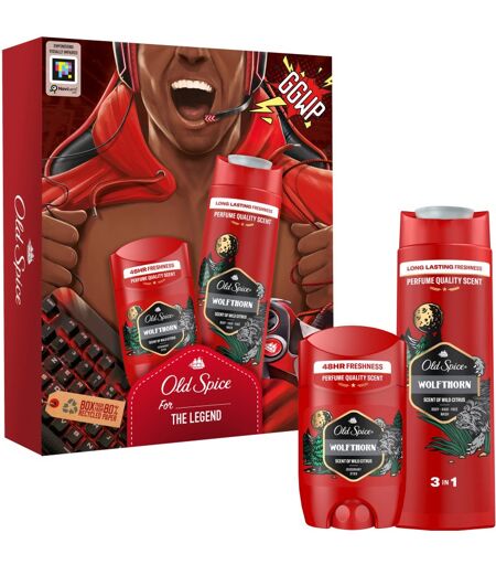 Old Spice Wolfthorn Wolf Gamer, , Kropssæt til mænd til mænd, Produkt Old Spice Wolfthorn Wolf Gamer er en nødvendig hjælp hver dag i kampen mod sved. Sættet indeholder: Old Spice Wolfthorn Brusegel 250 ml Old Spice Wolfthorn Deodorant Stick 50 ml Brugsvejledning: Brug alle produkterne i det kosmetiske sæt som angivet i vejledningen. ...