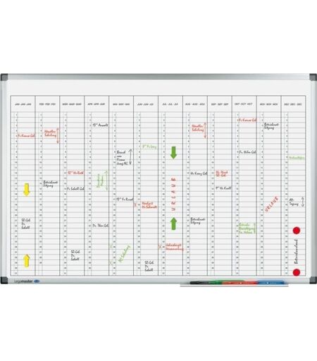 Planlægningstavle i format 60 x 90 cm og udformet som kalender med 12 lodrette måneder 1-31 dage. Overfladen er whiteboard, hvorpå der kan skrives med whiteboard markere. Egenskaber Årsplan kalender. Mål: 60 x 90 cm. ...