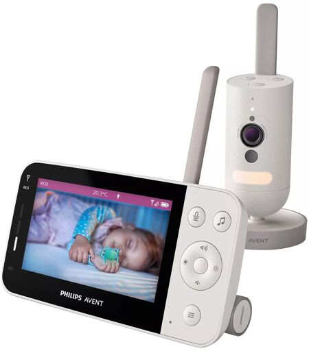 Med Philips Avent Connected Videophone kan du holde øje med babyen hvor som helst. Secure Connect-systemet til sikre forbindelser bruger flere krypterede kanaler mellem babyenheden og forældreenheden eller appen og opretholder dermed forbindelsen til den lille i hele huset. Dette sikrer en betryggende robust og privat forbindelse. Med forældreenheden, der dækker en maksimal rækkevidde på 400 meter rundt om hjemmet, forbliver du altid sikkert forbundet. Og uden for hjemmet tilbyder Baby Monitor+ appen ubegrænset rækkevidde via en mobil internetforbindelse eller Wi-Fi. Babyenheden har et Full HD-kamera med nattesynsfunktion og digital zoom og leverer klare billeder fra børnehaven dag og nat. Så hver bevægelse kan ses, hver latter kan høres. Den genopladelige forældreenhed har op til ca. 12 timers batterilevetid i Eco-tilstand og et 4,3" farvedisplay (diagonalt 10,9 cm). Du kan altså sagtens holde øje med barnet hele dagen og til langt ud på aftenen, inden enheden skal lades op. Babyenheden har et integreret rumtermometer og advarer i tilfælde af temperaturoverskridelser og underskud. På denne måde hjælper det med at sikre, at afkomene altid føler sig hjemme. Lige den rigtige mængde komfort til en perfekt lur. Babyenhedens integrerede natlys sikrer behagelige lysforhold på børneværelset. Via forældreenheden og Baby Monitor+ appen kan natlyset tændes og slukkes, eller lysstyrken kan justeres. SCD921/26 babyalarmen fungerer udelukkende med en rigtig intercom-funktion, så forældre og børn kan lytte til hinanden med et tryk på en knap uden afbrydelser, for eksempel ved audition, beroligelse eller grin af barnet. Du har også valget mellem 15 beroligende lyde, fra fuglesang i haven og natlige naturlyde til vuggeviser som Rock-a-Bye Baby. Og du kan også optage dine egne vuggeviser og spille dem efter ønske. Når alt kommer til alt, hvad fungerer bedre end lyden af forældrenes velkendte stemmer? Da forældreenheden og babyenheden på babymonitoren allerede er tilsluttet, kan du begynde at overvåge umiddelbart efter udpakning. Wi-Fi er nemt at sætte op, og Baby Monitor+ appen kan parres, når du har tid. ...
