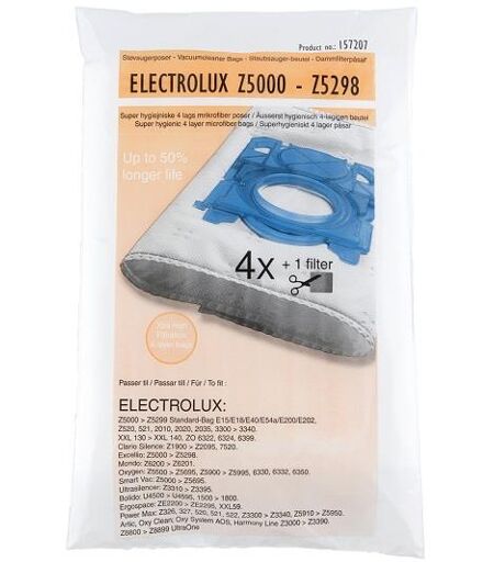 Electrolux støvsugerposer til: • Electrolux 5010-5020 Standard-Bag • Electrolux E15/E18/E40/E54a/E200/E202 • Electrolux XXL 130 til XXl140, ZO 6399 Indhold: • 4 stk. Microfibre Poser ...