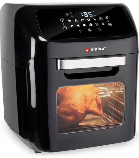 Alpina 12L Air Fryer Ovn En meget praktisk multifunktionel 12 liters ovn med Air Fryer-teknologi fra Alpina. Det giver dig mulighed for at lave mad, grille og bage sunde fedtfattige måltider til hele familien. Lav lækre pommes frites, bøf, fisk, rejer, kylling, varm pizza og meget mere! Air fryeren er udstyret med ovnlampe, touch-knapper, 9 præinstalleret programmer, temperatur- og tidskontrol.Inkluderet:Rotisseriespidser med gaflerVærktøj til fjernelse af spydTo madlavningsgitreEn opsamlingsbakkeSpecifikationer:Produkttype: Air fryerEffekt: 1800WStrøm: 220-240V ~ 50HzIndstillinger: 9 ...