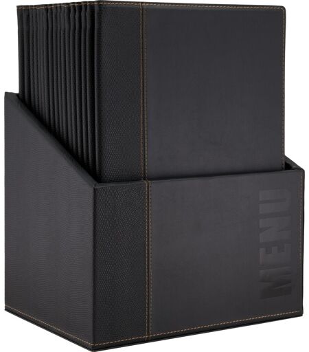 Securit Trendy Menukort – moderne og stilfuldt designSecurit er skaberen af den originale chalkmarker og har siden 1987 fortsat med at udvide og udvikle et sortiment der kombinerer deres professionelle varemærke med innovative designs inden for b.la. tavler og kridtkunst. I dag bruges Securits produkter af stort set alle typer mennesker og kan bruges til både professionelle og kreative formål – så uanset om du er forretningsmand, karrierekvinde, hipster, kreativ hobbyentusiast, barn eller bedsteforælder, så har Securit et produkt der passer til dig og dine behov.Securit A4 Trendy menuomslag har et stilfuldt og iøjefaldende design. Du får her et sæt med 20 menukort i en praktisk og matchende opbevaringsboks, som er en ideel løsning til at holde dine menuomslag pæne og organiserede. Menukortene har syede kanter og er præget med ordet "Menu" og passer perfekt ind på enhver moderne bar, café eller restaurant. Hvert menukort indeholder en dobbeltsidet kvalitetslomme i pp-plast, så du kan indsætte 4 stk. A4-sider og takket være den praktiske elastiske holder kan du ydermere udvide dine menukort med op til 40 stk. A4-sider ved tilkøb af flere Securit menukortlommer.Du kan med stor fordel kombinere dine Trendy menukort med Trendy vinkort og regningsholdere, som har samme moderne og stilfulde design. På den måde kan du skabe et strømlinet og ensartet udtryk ud mod dine kunder.Sæt med 20 menukort inkl. opbevaringsboksFarve: SortStørrelse: A4Materiale omslag: PU (kunstlæder)Materiale lommer: PP-plastSyede kanter og ordet ”Menu” præget på forsidenLette at rengøre Opbevaringsboks til organisering af menukortHvert menukort er inklusiv 1 stk. dobbeltsidet lomme med plads til 4 x A4-siderHvert menukort kan udvides med op til 10 stk. dobbeltsidede lommer med plads til 40 x A4-siderGiver din virksomhed et moderne og stilfuldt touch Passer perfekt ind i et smart og trendy restaurationsmiljø ...