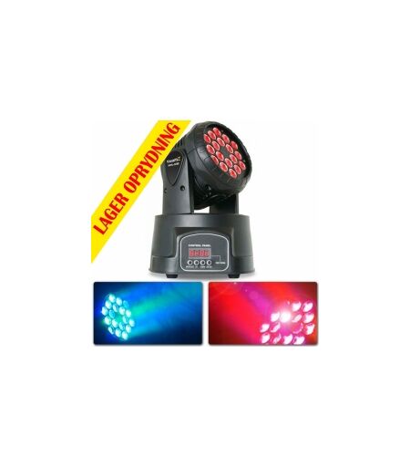 Et 11-kanals DMX-moving head med 18 kraftfulde 3W LED'er, der giver en farverig wash-effekt. Variabel elektronisk strobe og dimmer, macro programmer, avanceret funktionskontrol, pan / tilt invert-option og hast... - TILBUD NU, pris kun 969,00 (før 1709,00) ...