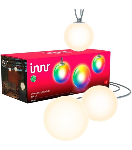 Med Outdoor Smart Globe Light Colour 3-Pack fra INNR kan haven eller altanen blive smagfuldt og intelligent oplyst. Dette sæt består af tre armaturer og en bred vifte af tilbehør, som armaturerne kan hænges eller opsættes med. Armaturerne genererer en lysstrøm på op til 370 lumen hver, er dæmpbare og skinner om nødvendigt varmt hvidt til køligt hvidt eller farve. Kontrol sker via app eller stemme. ...