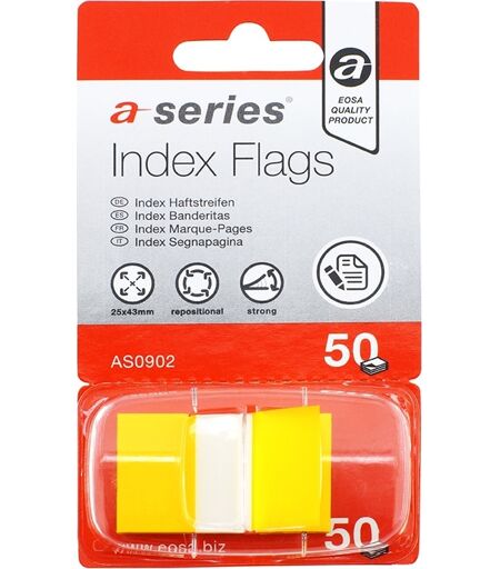 a-series Indexfaner Plast 12x44 mm, gul - det billige valg a-series er memoblokke i verdensklasse! Produceret hos en af verdens førende producenter af notes, hvor der ikke bare hersker fokus på at producere kvalitetspapir med stærk lim, hvor både produkter og processer er optimeret efter høje standarder. Indexfaner er et genialt redskab, når du skal markere eller huske særlige steder i en bog, i dine huskesedler eller større papirmængder. Du kan få indexfaner i en lang række forskellige udformninger, designs og farver. Materiale: Plast Format: 25x43 mm Farve: Gul 50 faner Vandbaseret lim uden opløsningsmidler ...