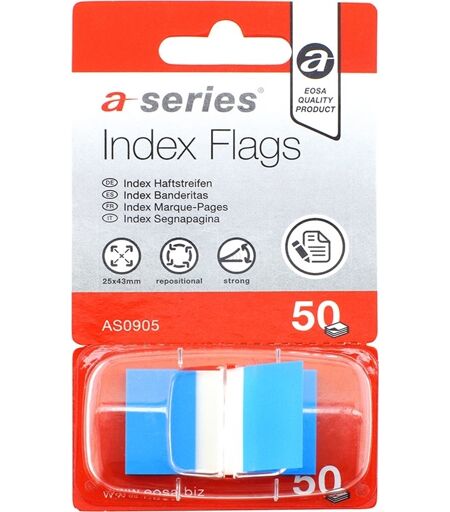 a-series Indexfaner Plast 12x44 mm, blå - det billige valg a-series er memoblokke i verdensklasse! Produceret hos en af verdens førende producenter af notes, hvor der ikke bare hersker fokus på at producere kvalitetspapir med stærk lim, hvor både produkter og processer er optimeret efter høje standarder. Indexfaner er et genialt redskab, når du skal markere eller huske særlige steder i en bog, i dine huskesedler eller større papirmængder. Du kan få indexfaner i en lang række forskellige udformninger, designs og farver. Materiale: Plast Format: 25x43 mm Farve: Blå 50 faner Vandbaseret lim uden opløsningsmidler ...