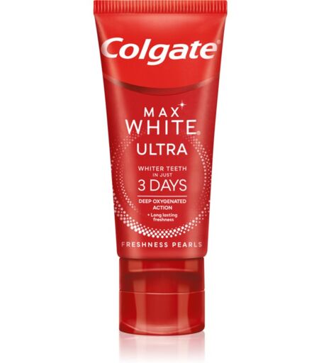 Colgate Max White Ultra Freshness Pearls, 50 ml, Tandpasta til tandblegning unisex, Tandpasta Colgate Max White Ultra Freshness Pearls er beregnet til at blege tænder skånsomt. Fjerner effektivt uønsket pigmentering fra tænder og belønner dig med et mere strålende smil ved regelmæssig brug. Egenskaber: bleger tænder kæmper mod karies og plak er skånsom mod tandemaljen genopbygger og plejer tandkød fjerner tandsten og plak giver bedre ånde Brugsvejledning: Gør det mindst to gange om dagen. ...