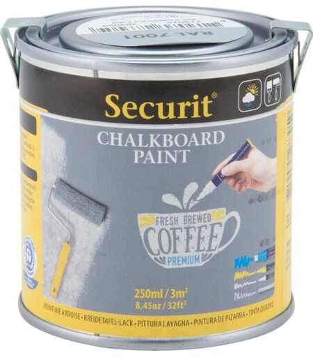 Securit Kridttavle Maling – lav din egen smarte kridttavle hvor som helst Securit er skaberen af den originale chalkmarker og har siden 1987 fortsat med at udvide og udvikle et sortiment der kombinerer deres professionelle varemærke med innovative designs inden for b.la. tavler og kridtkunst. I dag bruges Securits produkter af stort set alle typer mennesker og kan bruges til både professionelle og kreative formål – så uanset om du er forretningsmand, karrierekvinde, hipster, kreativ hobbyentusiast, barn eller bedsteforælder, så har Securit et produkt der passer til dig og dine behov.Der er ingen grænser med Securit tavlemaling. Gør stort set alt til en tavle, både indendørs og udendørs. Det eneste du skal gøre, er at påføre den vandbaserede grå akrylmaling på en overflade og lade den tørre, hvorefter du frit kan skrive og tegne på den med Securit kridtmarkere eller traditionelt kridt. Denne dåse indeholder 250 ml og dækker op til 3 m². Malingen kan bruges på nærmest alle overflader, bruges den på ikke-glatte overflader anbefales det at bruge en primer først for at opnå det bedste resultat. Når tavlen bruges indendørs, anbefales det at bruge Securit originale kridtmarkere, hvorimod det anbefales at bruge de vandfaste kridtmarkere fra Securit hvis tavlen bruges indendørs, så dine budskaber ikke forsvinder hvis det regner og de bliver våde.Farve: GråIndhold: 250 mlVandbaseret akrylmaling Gør stort set alt til en tavle Dækker op til 3 m²Til både indendørs og udendørs brug ...