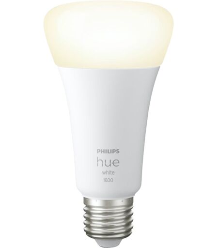 Philips Hvide Hue pærer A67 - E27 pære - 1600lm - 1-pak. Type: Smart pære, Produktfarve: Hvid, Grænseflade: Bluetooth/Zigbee. Energieffektivitetsklasse: F, Energiforbrug pr. 1000 timer: 16 kWh, Energieffektivitetsskala: A til G. Bredde: 67 mm, Dybde: 67 mm, Højde: 131 mm. Pakketype: Kasse, Pakkebredde: 72 mm, Pakkedybde: 72 mm. Antal pr. pakke: 1 stk, Antal inkluderede farvetonepærer: 1 pære(r ) ...