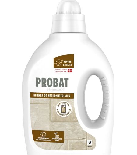Kvalitetsæbe til rengøring af klinker og naturmaterialerProbat Natursæbe er specielt designet til rengøring af naturmaterialer, såsom uglaserede klinker, marmor, tegl, linoleum og skifer. Natursæben rengør og plejer i én og samme arbejdsgang og beskytter dine gulve og naturmaterialer mod slid og pletter for at give dem en smukkere glød. Kombinationen af kokos- og sojasæbe i Probat Natursæbe giver sæben en mild og plejende virkning, samtidigt med at gulvet og naturmaterialet rengøres og bliver smukkere og lettere at holde. Sæben er tilmed mild og skånsom, så den er blid mod din hud, i tilfælde af det skulle komme på dine hænder under rengøring. Dertil leveres Probat Natursæbe i flasker af 97% genanvendt plast. Indhold: 700 mlNatursæbe til klinker og naturmaterialerRengør og plejer i samme arbejdsgangDosering: 60 ml til 5 liter lunken vand ...