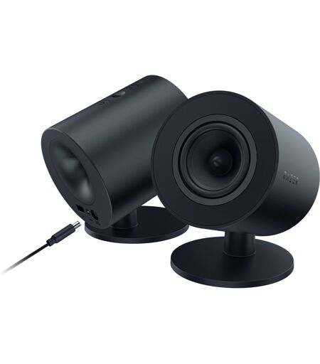 Med Razer Nommo V2 X handler det om at vinde - med optimal lydunderstøttelse. Nommo V2 X-sættet består af de to satellithøjttalere, hver med en 3,2" fuldtonedriver, og producerer således en rig stereolyd. Ud over Razer Chroma RGB-belysningen understøtter Nommo V2 Pro THX Spatial Audio og kan bruges enten kablet (via USB) eller trådløst via Bluetooth. ...