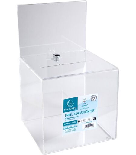 Exacompta stemmeboks Exacompta stemmeboksen med låsbart låg er ideel til konkurrencer, lodtrækninger, valg eller forslag. Den transparente stemmeboks måler 21x21x21 cm og er fremstillet af førsteklasses akryl med meget høj gennemsigtighed. Boksen har et A5-skilt som kan personaliseres, samt et hængslet og låsbart låg, hvilket sikrer, at indholdet forbliver sikkert, hvortil det praktiske indkast i låget gør det nemt at indsætte stemmesedler. Boksen er fremstillet i Europa og leveres med en 5-års garanti. Farve: Transparent Materiale: Akryl (PMMA) A5-skilt til personalisering Låsbart låg for sikring af indhold Fremstillet i Europa Mål på boks (LxDxH): 21 x 21 x 21 cm Mål på A5-skilt (LxB): 21 x 14,8 cm Exacompta – kvalitet og ekspertise siden 1928 Exacompta er en fransk virksomhed, som siden 1928 har produceret højkvalitets kontorartikler og papirvarer. Deres brede kontorsortiment kombinerer traditionelt håndværk med moderne design. Exacompta er kendt for deres engagement i innovation og miljøansvar, hvilket gør dem til et foretrukket valg for både professionelle og private brugere. Med en stærk tradition for kvalitet og ekspertise har Exacompta etableret sig som en ledende leverandør af kontorartikler i Europa. ...