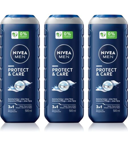 NIVEA MEN Protect & Care, , Kropssæt til mænd til mænd, Showergelen NIVEA MEN Protect & Care gør den nødvendige hverdagshygiejne til en enestående forfriskende oplevelse. Sættet indeholder: 3x Brusegel 500 ml Egenskaber: vasker forsigtigt huden over hele kroppen giver friskhed og energi efter brug sæt til en fordelagtig pris Brugsvejledning: Påfør produkt på fugtig hud, og vask alle urenheder af. Skyl grundigt. ...