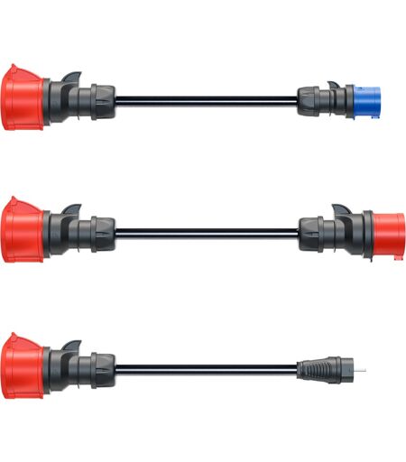 De 30 cm lange adapterkabler CH-04-07 fra go-e sikrer pålidelig opladning med go-e Charger Gemini flex 22 kW (32A CEE rødt trefaset stik) ved normale husholdningsstik, campingstik og CEE røde 16A trefasede stik. Med det komplette sæt adaptere kan du oplade din bil når som helst og hvor som helst, uanset hvilken type stikkontakter der bruges i hver region. Imidlertid er ikke alle almindelige husholdningsstik designet til en ladestrøm på 16A. Det anbefales at oplade med 10A med denne adapter. I nogle lande som Storbritannien er det dog ikke tilladt at oplade med 10A ved en stikkontakt, så det er nødvendigt at bruge landeindstillingen i go-e Charger-appen for at bruge adapteren. Adaptersættet med 3 dele er også kompatibelt med go-e Charger HOME+ 22 kW. ...