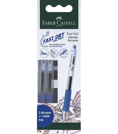 Faber-Castell Fast Gel Rollerpen – blød og behagelig skriveoplevelse Oplev præcision og en flydende, blød og behagelig skriveoplevelse med Faber-Castell Fast Gel Rollerpen. Denne rollerpen med 0,7 mm spids sikrer en skarp og klar skrift hver gang. Den er ideel til både studerende og professionelle, der værdsætter hurtigtørrende blæk, der ikke tværer ud, hvilket gør den perfekt til venstrehåndede brugere såvel som til skitsering og detaljeret skrivning. Pennens ergonomiske greb sikrer en god skrivekomfort, selv under lange skrivesessioner. Sampak med 2 penne og 1 refill Blækfarve: Blå Stregbredde: 0,7 mm Hurtigttørrende gelbaseret blæk Ekstra blød gribezone i skrivefarven ...
