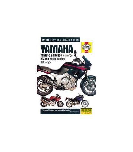 With a Haynes Manual, you can do it yourself, from simple maintenance to full repairs. Every Manual is based on a complete stripdown. Our authors and technicians work out the best methods to do a job and present this with the home mechanic in mind. Our Manuals have clear instructions and hundreds of photographs that show each step. Whether you're a beginner or a competent mechanic, you can save money with Haynes., Each Manual includes:, Clear and easy to follow page layout, Full procedures written from hands-on experience, Easy-to-follow photos, Faultfinding information, How to make special tools, Colour wiring diagrams (where available).Specific Models Covered:TDM850 849cc 91-99; TRX850 849cc 96-99; XTZ750 Super Tenere 749cc 89-95. ...