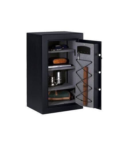 Master Lock T0-331 stålværdiboks med et eksklusivt og flot design Værdiboksen er ideel til at sikre værdifulde genstande, dokumenter og personlige ejendele. Boksen har en flot pulverlakeret overflade i sort og et tidløst design. En værdiboks der ligefrem pynter og passer godt ind på ethvert kontor og i ethvert hjem. Sikkerhedsboksen er foret indvendigt for at undgå ridser på værdigenstande. Pengeskabet er udstyret med tre hylder og kan rumme 15 ringbind. Konstruktion Værdiskabet har en solid stål konstruktion og har en vægtykkelse på 3 mm og en dørplade på 6 mm. Fastboltning Værdiboksen er forberedt for fastboltning i bunden og sikrer at en eventuel tyv ikke løber bort med hele boksen. Bolte medfølger. Lås Boksen er udstyret med en brugervenlig el-kodelås i et flot design, som nemt betjenes. Nødlås medfølger. Specifikationer: Udvendige mål (HxBxD): 958x551x502 mm Indvendige mål (HxBxD): 928x520x359 mm Kapacitet: 173,2 liter Vægt: 108,9 kg El-kodelås - 4 x AA batterier (batterier medfølger ikke) Forberedt for fastboltning bunden (bolte medfølger) Farve: Sort Foret indvendigt ...