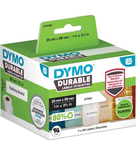 Dymo LabelWriter Durable etiketter str. 25 x 89 mm Super stærke etiketter, som passer til vanskelige underlag. Disse etiketter er stærkere og holder længere, end etiketter af papir. Med et klæbemiddel i industrikvalitet, samt coating, som modstår afslidning og afskalning som følge af varme, fugt og opløsningsmidler, er disse etiketter super holdbare. Disse etiketter holder længere, og er mere slidstærke end standard LabelWriter etiketter. Etiketterne er velegnede til gulvmærkning, hylder, kemikalieopbevaring, m.v. Sikrer fastklæbning på vanskelige underlag f.eks. metal, træ, glas m.m. Tåler industriolier og rensemidler, pga. den super holdbare belægning. Fugtresistente etiketter, der tåler op til 85% luftfugtighed Tåler temperaturer fra -18° til 50°C Beskyttende belægning (coating) med ekstra modstandsdygtighed Fungerer sammen med DYMO LabelWriter etiketprintere Farve: sort på hvid Størrelse etiketter: 25 x 89 mm Antal etiketter: 700 stk ...