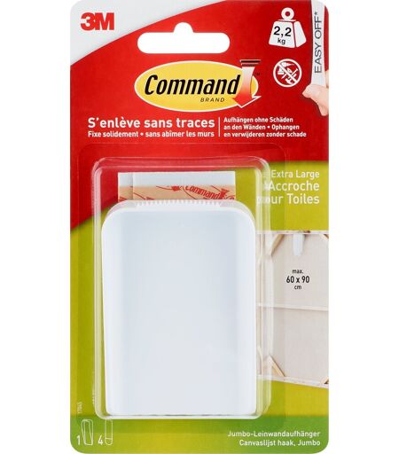 Den ideelle løsning til ophæng af store lærredsrammer og -billederCommand er en ny og avanceret teknologi indenfor klæbestrips, som klæber rigtig godt og som nemt kan fjernes uden spor med et enkelt stræk i strippen. Command klæbestrips har en stærk bæreevne og findes i mange varianter og størrelser, som altid sikrer dig en skadefri ophængning, uden brug af værktøj og andre hjælpemidler, selv på overflader der ellers kan være svære at klæbe på. Command jumbo lærredsophæng er en smart og praktisk løsning til ophængning af store lærreder, malerier, print på kanvas og vægdekorationer. Du kan derfor nemt og hurtigt dekorerer dit hjem med billedcollager og gallerivægge – dekorationsmulighederne er nærmest uendelige. Ophænget kan bruges til nem opsætning på mange forskellige overfalder som f.eks. massive, hule og malede vægge, samt træ, fliser, metal og glas. Ophænget kan desuden bruges til de fleste typer lærreder op til 60 x 90 cm og du sætter blot ophænget op på væggen og anbringer billedet på det – så simpelt er det. De små takkede riller rækker nemlig ind i lærredsrammen eller blændrammen og giver et ekstra godt greb og en sikker ophængning og vil du prøve noget nyt eller flytte rundt, kan ophænget nemt fjernes uden at beskadige overfladen nedenunder. De praktiske og effektive klæbestrips sikrer at diverse lærredsophæng og dekorationer sidder rigtig godt fast og stripsene efterlader ingen skader og mærker, hverken ved opsætning eller fjernelse, i modsætning til opsætning med f.eks. skruer og søm.Indhold: 1 ophæng og 4 store stripsFarve: Hvid Striptype: VandbestandigBæreevne: 2,2 kg – lærreder op til 60 x 90 cmSkadefri ophæng – klæber godt, fjernes nemt ...