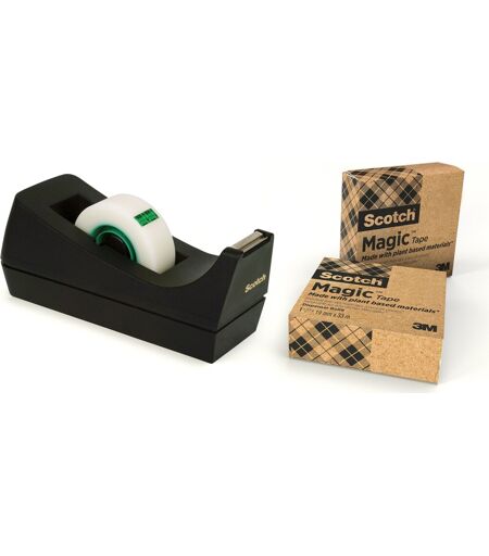 Scotch Magic plantebaseret kontortape Den velkendte Magic tape er sand kontorklassiker. Tapen er usynlig på de fleste papirtyper. Perfekt til reparation og forsegling af dokumenter og usynlig ved scanning eller fotokopiering. Tapen er matteret på rullen, men usynlig, når den anvendes. Det permanente klæbemiddel giver holdbar en klæbeevne uden at efterlade spor. Tapen gulner ikke over tid og ødelægger ikke fotos, trækkes let af rullen og er nem at rive over. Tapen kan skrives på med kuglepen, blyant eller tuschpen og kaldes også englehud på grund af sin gennemsigtige og fine kvalitet. Tapen er produceret med 66% plantebaseret klæbemiddel der heller ikke indeholder opløsningsmidler. Tapekernen er produceret af 98% genanvendt plast. Kvaliteten på tapen er fuldt på højde med den du kender fra den traditionelle Magic tape. Sampak med 1 stk. Scotch C38 dispenser + 3 ruller Scotch Magic tape Farve på tape: Klar Farve på dispenser: Sort Dispenseren har skridsikker gummibund, en god vægt og kan enhåndsbetjenes Tapen er velegnet til at skrive på samt usynlig på fotokopier og scanninger Tapebredde: 19 mm Længde på rullen: 33 m ...