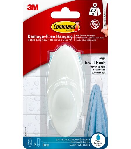 Smart og praktisk håndklædekrog til badeværelset Command er en ny og avanceret teknologi indenfor klæbestrips, som klæber rigtig godt og som nemt kan fjernes uden spor med et enkelt stræk i strippen. Command klæbestrips har en stærk bæreevne og findes i mange varianter og størrelser, som altid sikrer dig en skadefri ophængning, uden brug af værktøj og andre hjælpemidler, selv på overflader der ellers kan være svære at klæbe på. Command kroge og ophæng til badeværelset giver dig god mulighed for at holde de vigtigste ting tilgængelige, organiserede og indenfor rækkevidde – perfekt til at holde orden på alle dine badeværelsesartikler og leveres alle med vandbestandige klæbestrips, som kan bruges til nem opsætning på mange forskellige overflader som f.eks. spejle, glas, træ, fliser og malede overflader i både varme, våde og fugtige rum og miljøer.Hånklædekrogen er en god og ideel løsning til ophængning af alle slags håndklæder, badekåber og andet badeværelsestilbehør og vasketilbehør du ønsker skal være lige ved hånden. De praktiske og effektive klæbestrips sikrer at krogen sidder rigtig godt fast og stripsene efterlader ingen skader og mærker, hverken ved opsætning eller fjernelse, i modsætning til f.eks. sugekopper, skruer og søm. Samtidig er det testet og bevist at stripsene har en bedre og stærkere bæreevne end sugekopper, så du opnår en bedre og mere holdbar opsætning af dit badeværelsesinventar.Indhold: 1 krog og 1 stor stripMateriale: Matteret plastStriptype: VanbestandigBæreevne: 2,2 kgSkadefri ophæng – klæber godt, fjernes nemt ...