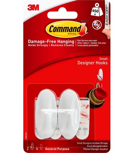 Klassiske designerkroge Command er en ny og avanceret teknologi indenfor klæbestrips, som klæber rigtig godt og som nemt kan fjernes uden spor med et enkelt stræk i strippen. Command klæbestrips har en stærk bæreevne og findes i mange varianter og størrelser, som altid sikrer dig en skadefri ophængning, uden brug af værktøj og andre hjælpemidler, selv på overflader der ellers kan være svære at klæbe på. Command klassiske designerkroge er en smart og praktisk løsning til ophængning af f.eks. små køkkenredskaber, rengøringsredskaber, viskestykker og mange andre små og lette ting i hjemmet. Krogene leveres med indendørs klæbestrips, som kan bruges til nem opsætning på mange forskellige overfalder som f.eks. massive, hule og malede vægge, samt træ, fliser, metal og glas.De praktiske og effektive klæbestrips sikrer at krogene sidder rigtig godt fast og stripsene efterlader ingen skader og mærker, hverken ved opsætning eller fjernelse, i modsætning til opsætning med f.eks. skruer og søm. Indhold: 2 kroge og 4 små stripsMateriale: Hvid plastStriptype: IndendørsBæreevne: 450 gSkadefri ophæng – klæber godt, fjernes nemt ...