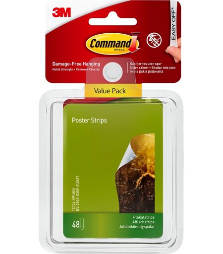 Den ideelle løsning til ophæng af plakater Command er en ny og avanceret teknologi indenfor klæbestrips, som klæber rigtig godt og som nemt kan fjernes uden spor med et enkelt stræk i strippen. Command klæbestrips har en stærk bæreevne og findes i mange varianter og størrelser, som altid sikrer dig en skadefri ophængning, uden brug af værktøj og andre hjælpemidler, selv på overflader der ellers kan være svære at klæbe på. Command plakatstrips er en smart og praktisk løsning til ophængning af plakater, skemaer, kalendere, billeder uden ramme og andre lette genstande i hjemmet. Plakatstripsene gør dermed dekoration og plakatophæng til en nem og hurtig opgave der kan klares på ingen tid.Klæbestripsene kan bruges til nem opsætning på mange forskellige overfalder som f.eks. massive, hule og malede vægge, samt træ, fliser, metal og glas. Samtidig holder stripsene plakater fladt ind til væggen og holdes diskret skjult bag den og vil du prøve noget nyt eller flytte rundt, kan de nemt fjernes uden at beskadige overfladen nedenunder. De praktiske og effektive klæbestrips sikrer at plakter og andre lette genstande sidder rigtig godt fast og stripsene efterlader ingen skader og mærker, hverken ved opsætning eller fjernelse, i modsætning til opsætning med f.eks. dobbeltklæbende tape, tegnestifter og stiftsøm.Indhold: 48 små stripsFarve: Hvid Striptype: IndendørsBæreevne: 4 strips kan holde en plakat på pladsSkadefri ophæng – klæber godt, fjernes nemt ...