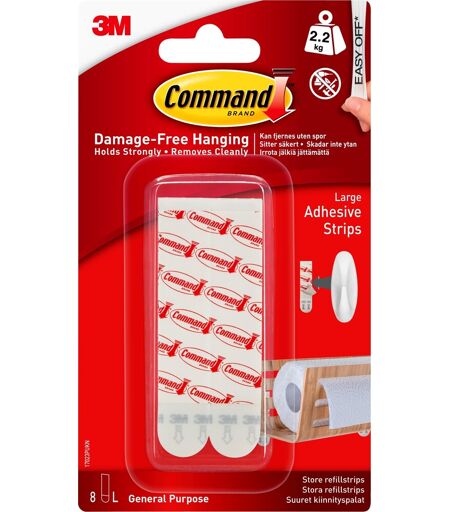 Refill klæbestrips med skadefri opsætning og fjernelseCommand er en ny og avanceret teknologi indenfor klæbestrips, som klæber rigtig godt og som nemt kan fjernes uden spor med et enkelt stræk i strippen. Command klæbestrips har en stærk bæreevne og findes i mange varianter og størrelser, som altid sikrer dig en skadefri ophængning, uden brug af værktøj og andre hjælpemidler, selv på overflader der ellers kan være svære at klæbe på. Command store refill klæbestrips er smarte og nyttige dobbeltklæbende monteringsstrips til en hurtig og nem opsætning på en lang række forskellige overfalder som f.eks. massive, hule og malede vægge, samt træ, fliser, metal og glas. Stripsene er samtidig lette at fjerne igen og efterlader ingen mærker eller skader.Indhold: 6 store stripsFarve: Hvid Striptype: IndendørsStørrelse: StorBæreevne: 2,2 kgSkadefri ophæng – klæber godt, fjernes nemt ...