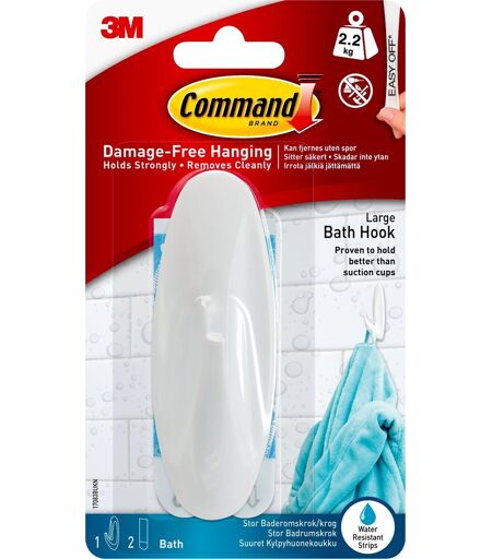 Flot designerkrog til badeværelsetCommand er en ny og avanceret teknologi indenfor klæbestrips, som klæber rigtig godt og som nemt kan fjernes uden spor med et enkelt stræk i strippen. Command klæbestrips har en stærk bæreevne og findes i mange varianter og størrelser, som altid sikrer dig en skadefri ophængning, uden brug af værktøj og andre hjælpemidler, selv på overflader der ellers kan være svære at klæbe på. Command kroge og ophæng til badeværelset giver dig god mulighed for at holde de vigtigste ting tilgængelige, organiserede og indenfor rækkevidde – perfekt til at holde orden på alle dine badeværelsesartikler og leveres alle med vandbestandige klæbestrips, som kan bruges til nem opsætning på mange forskellige overflader som f.eks. spejle, glas, træ, fliser og malede overflader i både varme, våde og fugtige rum og miljøer.Den store designerkrog er en god og ideel løsning til ophængning af badeværelsestilbehør og vasketilbehør, samt andre tunge genstande. Brug f.eks. krogen til ophængning af håndklæder, badekåber og andet badeværelsesudstyr du ønsker skal være lige ved hånden. De praktiske og effektive klæbestrips sikrer at krogen sidder rigtig godt fast og stripsene efterlader ingen skader og mærker, hverken ved opsætning eller fjernelse, i modsætning til f.eks. sugekopper, skruer og søm. Samtidig er det testet og bevist at stripsene har en bedre og stærkere bæreevne end sugekopper, så du opnår en bedre og mere holdbar opsætning af dit badeværelsesinventar.Indhold: 2 kroge og 4 mellemstore stripsMateriale: Hvid plastStriptype: VanbestandigBæreevne: 2,2 kgSkadefri ophæng – klæber godt, fjernes nemt ...