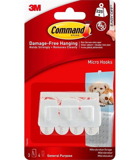 Smarte og praktiske mikrokroge Command er en ny og avanceret teknologi indenfor klæbestrips, som klæber rigtig godt og som nemt kan fjernes uden spor med et enkelt stræk i strippen. Command klæbestrips har en stærk bæreevne og findes i mange varianter og størrelser, som altid sikrer dig en skadefri ophængning, uden brug af værktøj og andre hjælpemidler, selv på overflader der ellers kan være svære at klæbe på. Command mikrokroge er en smart og praktisk løsning til ophængning af lette genstande som f.eks. kalendere og nøgler og leveres med indendørs klæbestrips, som kan bruges til nem opsætning på mange forskellige overfalder som f.eks. massive, hule og malede vægge, samt træ, fliser, metal og glas.De praktiske og effektive klæbestrips sikrer at krogene sidder rigtig godt fast og stripsene efterlader ingen skader og mærker, hverken ved opsætning eller fjernelse, i modsætning til opsætning med f.eks. skruer og søm. Indhold: 3 kroge og 4 små stripsMateriale: Hvid plastStriptype: IndendørsBæreevne: 225 gSkadefri ophæng – klæber godt, fjernes nemt ...