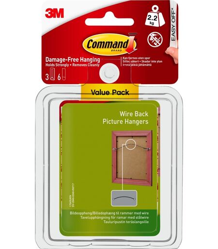 Praktisk og smart opsætning af billederCommand er en ny og avanceret teknologi indenfor klæbestrips, som klæber rigtig godt og som nemt kan fjernes uden spor med et enkelt stræk i strippen. Command klæbestrips har en stærk bæreevne og findes i mange varianter og størrelser, som altid sikrer dig en skadefri ophængning, uden brug af værktøj og andre hjælpemidler, selv på overflader der ellers kan være svære at klæbe på. Command billedophæng til wire er en smart og praktisk løsning til ophængning af rammer og billeder med trådophæng og wire på bagsiden. Ophænget er perfekt til opsætning af billeder og rammer med trådbagside, da du undgår bøvl når billedet eller rammen skal hænges op. Vil du prøve noget nyt eller flytte rundt, kan ophænget nemt fjernes uden at beskadige overfladen nedenunder, hvilket gør det ideelt til at eksperimenterer med forskellige vægophæng. Billedophænget kan bruges til nem opsætning på mange forskellige overfalder som f.eks. massive, hule og malede vægge, samt træ, fliser, metal og glas. Billedophænget er desuden velegnet til brug i stedet for et søm eller en krog og giver en mere sikker ophængning.De praktiske og effektive klæbestrips sikrer at diverse billedophæng og dekorationer sidder rigtig godt fast og det selvklæbende ophæng efterlader ingen skader og mærker, hverken ved opsætning eller fjernelse, i modsætning til opsætning med f.eks. skruer og søm.Indhold: 3 ophæng og 6 store stripsFarve: Hvid Striptype: VandbestandigBæreevne: 2,2 kgSkadefri ophæng – klæber godt, fjernes nemt ...