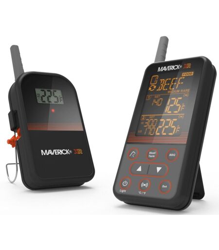 Det udvidede grill- og kødradiotermometer XR-40 er udstyret med den innovative INSTA-SYNC-teknologi®. Dette udvider rækkevidden (op til 160 meter), forbindelsen er hurtigere, og interferens under forbindelsen reduceres. Så du behøver aldrig bekymre dig igen, om kødet koger ved den rigtige temperatur. Derudover har den et tydeligt læseligt display på alle tidspunkter af dagen (Orange omvendt). Med de to sonder kan enten temperaturen i kogekammeret og kernetemperaturen på den grillede mad overvåges to forskellige kernetemperaturer eller to kogekammertemperaturer. Betjeningen er enkel, og XR-40 er med 15 forudindstillede temperaturer til forskellige typer kød. Yderligere komfort leveres af bippet, når den indstillede temperatur nås, og når forbindelsen afbrydes i mere end et minut. Temperaturen kan vises enten i Celsius eller Fahrenheit. ...