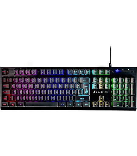 Multimedia gaming tastatur med RGB i metalMed iøjnefaldende RGB og en metalramme, der kan modstå selv de hårdeste kampe, har det SureFire KingPin X2-tastatur udseendet og musklerne til enhver spilopsætning.Med 5 aktive belysningstilstande og justeringer for hastighed og intensitet, kan spillerne indstille lysstemningen, så den passer til spilscenariet. Gør din spilopsætning levende i klare farver.Med et robust frontpanel i aluminium er KingPin X2 forberedt på kamp. I kombination med det stærke 1,8 m flettede kabel og en levetid på 10 millioner tastetryk ved du, at det kan modstå selv de mest barske spil. De 12 multimediefunktionstaster gør det muligt at styre lydstyrken eller belysningen hurtigt og nemt fra tastaturet, samt at afspille og sætte musik på pause eller åbne e-mail- eller webbrowsere. Og med de 25 anti-ghosting-taster opnås præcision og kontrol i spillet, selv når der trykkes på flere taster samtidigt.Specifikationer:Holdbart frontpanel i aluminiumLevetid på 10 millioner tastetrykMulti-valgfri RGB-belysning - 5 aktive tilstande og justerbar hastighed og lysstyrke (software ikke nødvendig)Med 25 anti-ghosting-taster12 multimedietaster1,8 m flettet USB-kabelMål L x B x H (mm): 443 mm x 141 mm x 41 mm (højde inklusive fødder)Vægt: cirka 940 gKabellængde: 1,8 mTasteteknologi: MembranStørrelsestype: Fuld størrelseForbindelsestype: KabletNominelle værdier: 5 V/260 mA (maks.)Stiktype: USB-AProgrammerbar RGB-belysning: 5 aktive tilstande): Strømmende; Enkeltfarvet stræben; Rød farvebelysning, blå farvebelysning, grøn farvebelysningJusterbar lysintensitet – 3 niveauerJusterbar hastighed – 4 niveauerMultimediefunktionstaster.: 12Anti-ghosting-taster: 25 tasterTasters levetid: 10 millioner tastetrykResponstid: 8 msTastevandring: 3,6 mmAktiveringskraft for taster: 50+/-15 gProduktmateriale: Aluminiumslegering, ABS-plastKompatible softwareplatforme: Windows, Mac OS, Chrome OSKompatible enhedstyper: PC, Bærbar PC, Spillekonsol ...