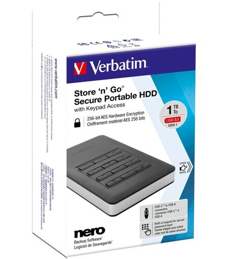 I dag er sikkerheden af dine fortrolige data af største betydning. Forestil dig at miste personlige filer, fordi du har glemt dem i et tog eller på bagsædet af en taxa, og du er klar over, at alle kan få adgang til dem, fordi de blev gemt på en standard harddisk. Nu får du Store 'n' Go sikker HDD med tastaturadgang for at bevare roen i sindet. AES 256-bit hardwarekryptering krypterer problemfrit alle data på drevet i realtid med et indbygget tastatur til indtastning af adgangskoden. Harddisken gemmer ikke adgangskoder i computerens eller systemets flygtige hukommelse, hvilket gør den langt mere sikker end softwarekryptering. Hvis den havner i de forkerte hænder, låses harddisken og kræver omformatering efter 20 mislykkede adgangskodeforsøg. Harddisken er kompatibel med både pc- og Mac-operativsystemer og har en grænseflade USB 3.1 GEN 1 med USB-C tilslutning til super hurtige dataoverførselshastigheder*. Pakken indeholder et USB-C- til USB-A-kabel samt en USB-A- til USB-C-adapter til tilslutning til en række enheder. Den kan også sluttes til et tv. Denne funktion er ikke mulig med almindelige krypterede harddiske. For yderligere sikkerhed leveres der Nero backupsoftware til at hjælpe dig med at sikkerhedskopiere alle dine filer, mapper og drev fra din bærbare computer eller pc, når som helst du ønsker det. Med den kan du også planlægge en automatisk sikkerhedskopiering på et bestemt tidspunkt og dag for at sikre, at det bliver gjort regelmæssigt! Nero backupsoftwaren er kompatibel med Windows Vista, Windows 7, Windows 8 og Windows 10 (ikke kompatibel med Mac OS). ...